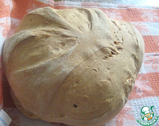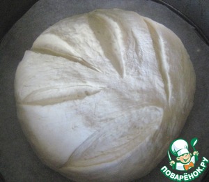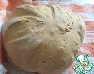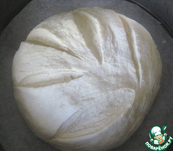 • Формируем хлебушек. Растягиваем тесто в пласт, загибаем края к центру «конвертом». Кладем на противень или в форму, делаем надрезы острым ножом. Оставляем отдыхать, накрыв салфеткой, еще на 40-45 минут.