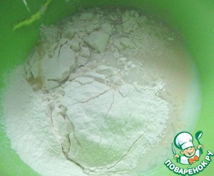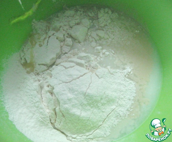 • Просеиваем еще 3 стакана муки (в общей сложности у меня ушло около 6,5-7 стаканов, с учетом муки для подпыливания).