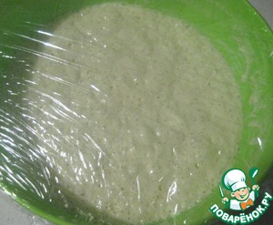 • Миску затягиваем пищевой пленкой и оставляем тесто в теплом месте на всю ночь подходить.