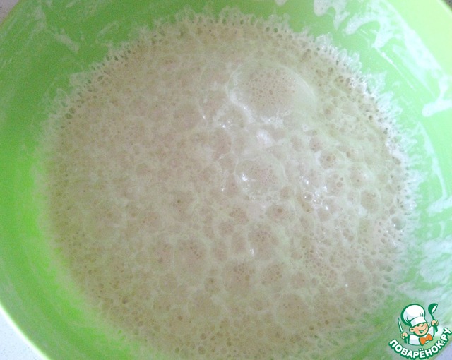 • Начинаем готовить с вечера. В миске перемешиваем сыворотку комнатной температуры, жидкий мед, дрожжи, соль, просеиваем примерно 3,5 стакана муки (половину нашей общей нормы). Перемешиваем.