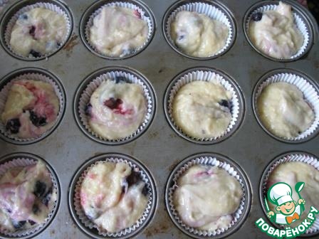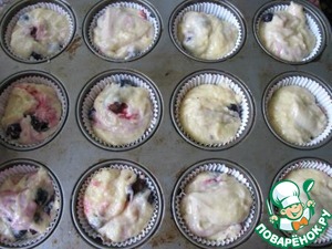 Добавить в тесто ягоды смородины (если смородина замороженная, то размораживать не надо!) и аккуратно, но быстро размешать. -