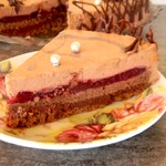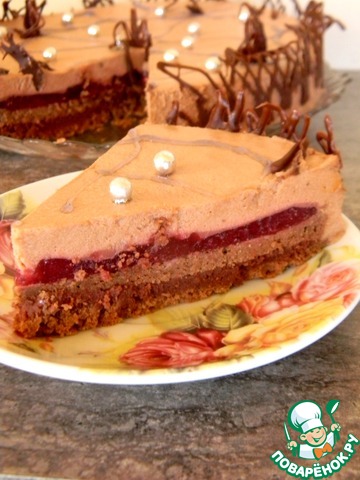 И, наконец, заливаем шоколадный мусс. Убираем в холодильник на 6-10 часов (или до полного застывания мусса). Достаем из формы и нарезаем на пирожные. У меня получилось 9 шт. Украшаем ягодами малины.