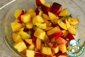 Нектраины помыть, нарезать кубиками примерно по 1 см., добавить к нектаринам листочки лимонного тимьяна и лимонный сок, перемешать и убрать в холодильник на 1 час.