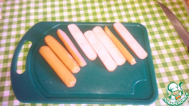 Сосиски порезать вдоль напополам. Если вы используете тонкие сосиски, то их можно не разрезать