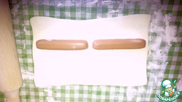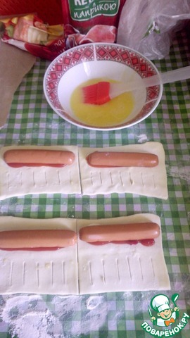Сверху кладем по половинке сосиски. Края смазываем яйцом