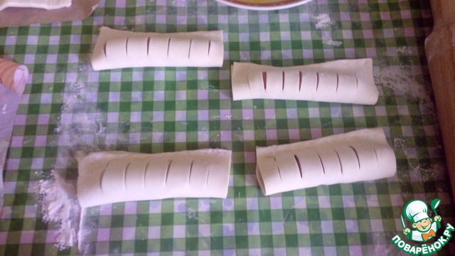 Раскатаное тесто разрезаем вдоль и поперек на 4 части. На длинном краю каждого квадрата делаем надрезы
