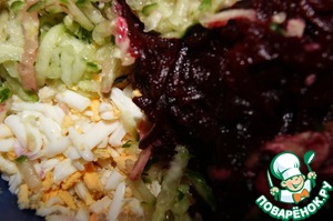 Свеклу, свежие огурцы и яйца натереть на крупной терке.
