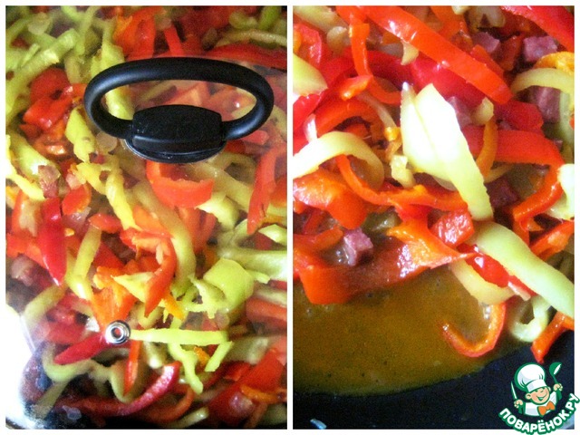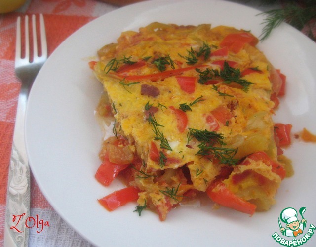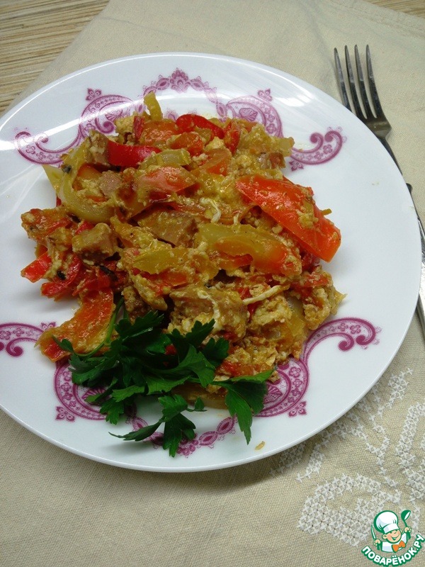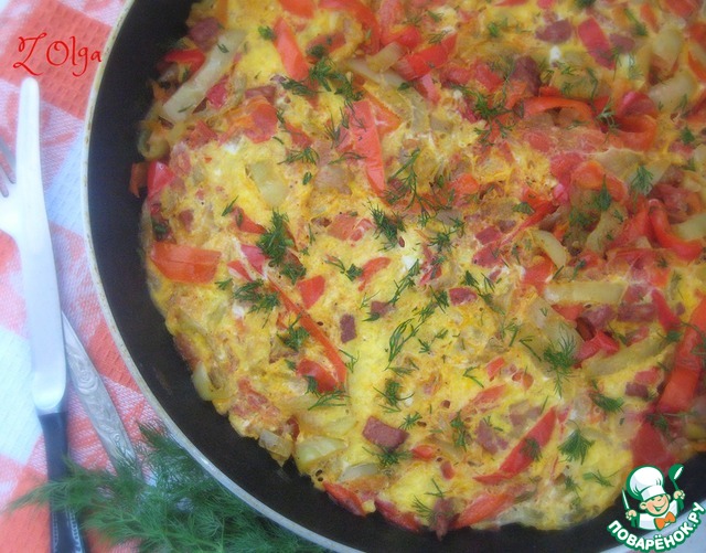 [+5]У меня , как мясное дополнение, были салями и сосиска. Хватило 2 крупных мясистых перца на сред.сковороду. Заливала 2 яйцами. Шикарно, вкусно, ярко, просто и легко