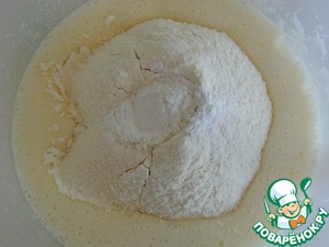 Добавляем муку и разрыхлитель. Перемешиваем.