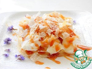 На лист выкладываем сливки, затем фрукты, поливаем карамелью, накрываем следующим листом, и так далее. Сверху раскрошить один лист и посыпать сахарной пудрой.