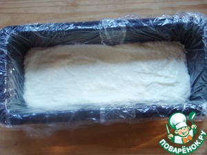 Теперь работать надо шустро, поскольку полученная масса очень быстро схватывается. Прямоугольную форму (25 Х 10 см) застелить пищевой пленкой и выложить третью часть массы.