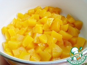 Очищенные от кожицы и косточки персики нарезать небольшими кубиками.