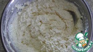 За это время приготовить начинку. Творог хорошо размять вилкой, добавить яйца, сливки, сахар, манку и все хорошо перемешать до однородной массы.