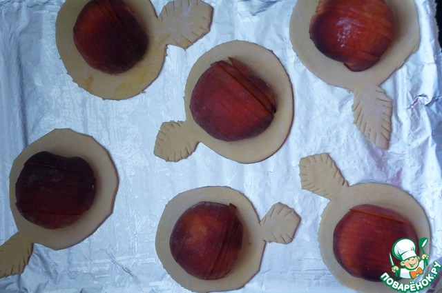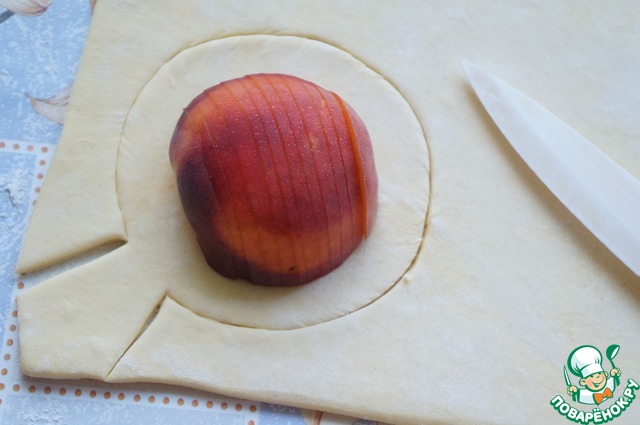 4. Тесто тонко раскатать, приложить персик и вырезать ножом основу, отступая от фрукта примерно 1 см. и оставляя листик.