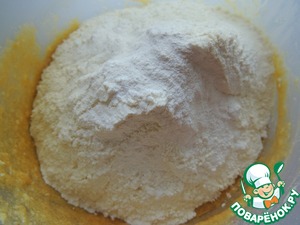 • Добавляем просеянную муку, щепотку соли и разрыхлитель.
