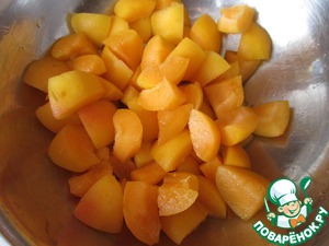 Теперь заливка. Абрикосы помыть, вынуть косточки. Порезать не мелко.