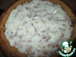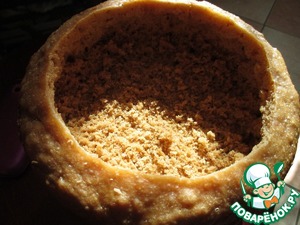 Теперь пудинговая начинка.. Приготовить пудинг, как указано на упаковке. (как раз здесь использовано молоко и сахарная пудра из ингредиентов в разделе "начинка") Замочить листики желатина на 10 минут в холодной воде. Отжать их и добавить в горячий пудинг. Размешать хорошенько. В пудинговую массу всыпать высушенные крошки. Перемешать. Выложить в корж.