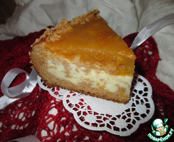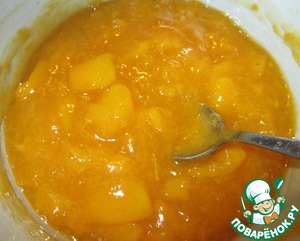 Теперь заливка. Абрикосовое пюре поставить на огонь, влить разведённые в 60 мл холодной воды 2 ст. л. крахмала. Размешать и варить на небольшом огне с момента кипения 5-7 минут, постоянно помешивая. Остудить.