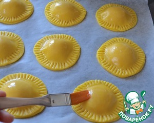 Выложить приготовленные таким образом все "равиоли" на противень, застеленный пекарской бумагой и смазать их белком. Выпекать в разогретой до 170°C духовке около 20 минут.