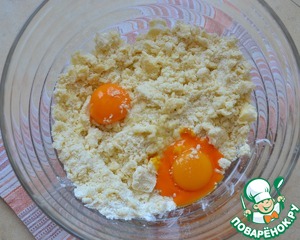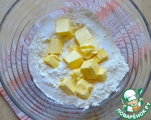 Просеять в миску муку, добавить сахар и кусочки размягченного масла. Перемешать руками до состояния мокрой крошки.