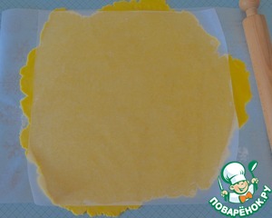 Тесто раскатать в тонкий пласт толщиной примерно 4-5 мм. Для удобства дальнейших манипуляций с тестом, раскатывайте его между двух листов пекарской бумаги...