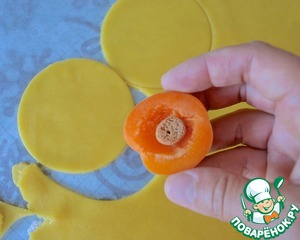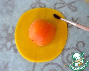 Положить половинку абрикоса на кружок из теста. С помощью кисточки смазать края диска яичным белком.