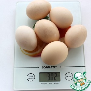 Итак, за основу пирога берем точный вес яиц в скорлупе. У меня были деревенские яйца, небольшого размера, вес которых составлял 302 г