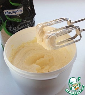 Мягкое сливочное масло взбить миксером с сахаром и щепоткой соли до пышной массы, на это уйдет, как минимум, 5-7 минут взбивания.