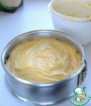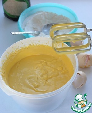 Добавлять во взбитую смесь по одному яйцу и по 2-3 ст. л. муки, постоянно продолжая взбивать, пока не введете все продукты. Добавить цедру лимона. Тесто получается, как сметана.