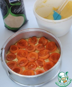 1 вариант. Выложить тесто, на тесто половинки абрикосов шкуркой вниз и присыпать коричневым сахаром.