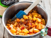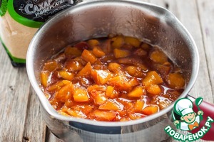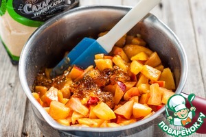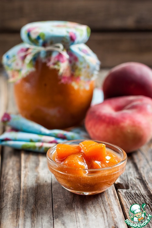 Всыпать нарезанные персики. Они зашипят, а карамель мгновенно схватится и затвердеет. Это нормально, так и должно быть. Варите еще 10 минут, немного перемешивая, персики пустят сок и карамель растворится. При желании в конце варки можно добавить немного лимонного сока