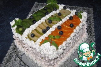 Украшаем собранный торт по желанию, желе с фруктами либо белковым кремом. На этом торте я тренировалась в использовании кондитерского мешка, поэтому украшения неказистые.
