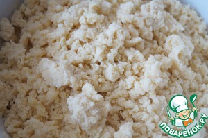 Размягченное сливочное масло растереть с сахарной пудрой, разрыхлителем и мукой. Должна получится масса в виде больших жирных крошек.