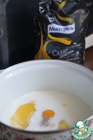 Пока тесто в холодильнике, делаем заливку. В мисочке смешать сметану с яйцом, молоком, коричневым сахаром и крахмалом. Все хорошо взбить.