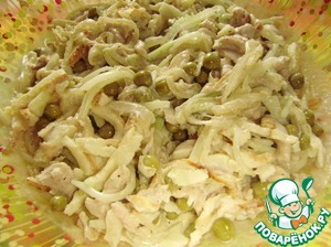 После того, как все составляющие части салата нарезаны, все соединить, добавить зеленый горошек, соль. Смешать по одной столовой ложке майонеза и сметаны и заправить салат. Вот и все! Приятного аппетита!