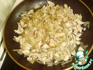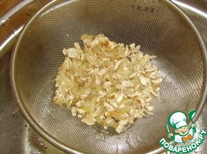 Готовую смесь из курицы и лука откинуть на дуршлаг, чтобы удалить лишний жир (масло).