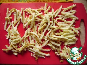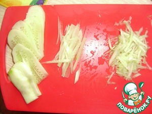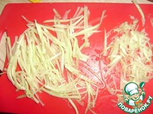 И так же нарезаем тоненькой соломкой. Я попробовала на крупной терке - много воды получается, так что лучше резать.