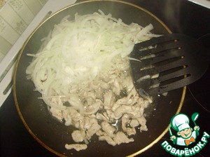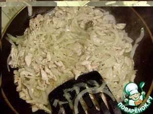 В это время большую головку лука нарезать тоненькими полукольцами, разобрать их, и как только мясо курицы побелело, добавить в сковороду и перемешать