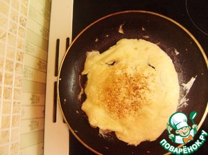 Выливаем яйца на сковороду и жарим тоненький яичный блинчик.