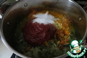 Теперь перловку, огурцы, обжаренные лук с морковью помещаем в большую кастрюлю, добавляем томатную пасту, соль, сахар и варим постоянно помешивая 30 минут с момента закипания.