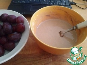 Хорошо всё вилкой подвзбила, порезала 3 шт сливы очень мелко. Много не нужно, утяжеляет тесто. Поставила в СВЧ на 3 минуты при мощности 800.
