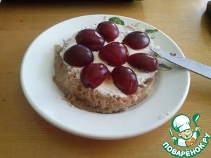 На сливы ещё выложила творог, накрыла второй половинкой бисквита, так же намазала кремом и опять выложила половинки сливы. Весь десерт обмазала оставшимся кремом. Поставила в холодильник на немного, чтобы остыл.