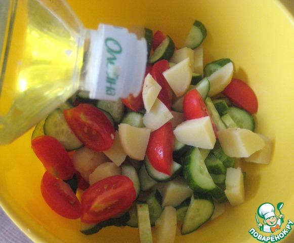 Нарезать очищенный картофель, помидоры и огурцы ломтиками одинакового размера. -