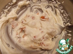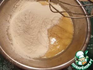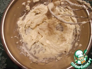 В полученную массу ввести просеянную с разрыхлителем муку, замесить тесто (должно получиться как густая сметана).