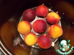 В смазанную сливочным маслом чашу мультиварки выложить в один слой персики, срезом вниз.