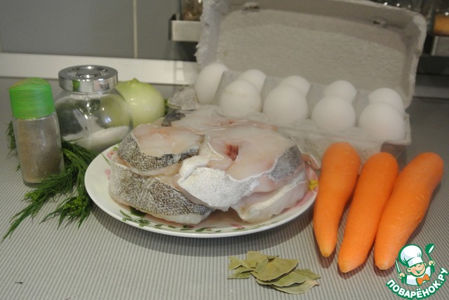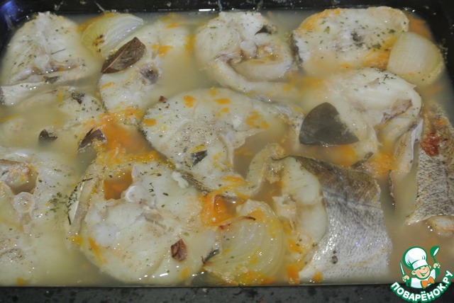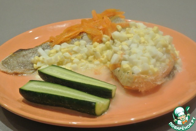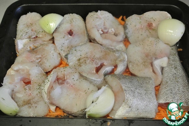 Морковь потереть, уложить на дно противеня, сверху рыбу ( желательно порционными кусками ), посолить, поперчить, положить лавровый лист и корень петрушки.