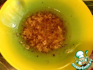 Смешиваем чеснок (измельчённый), соль, перец черный (у меня была смесь перцев в мельничке- очень люблю их), оливковое масло и уксус.