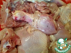 Курицу разделываем на порционные кусочки. Готовим маринад.