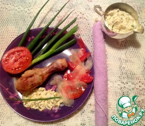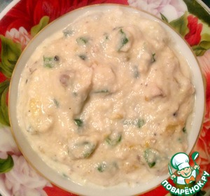 Маринад, оставшийся после курочки, на медленном огне проварить около 5 мин, добавить мягкий сыр и сметану. Поварить еще 1-2 мин и снять с огня. Добавить мелко порезанный зеленый лук- соус готов.