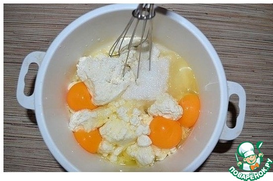 Сначала творог смешаем с сахаром, ванилином и яйцами.